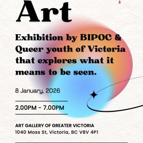 Come support BIPOC (Black, Indigenous, and people of color) and Queer youth explore what it means to be seen through an art exhibition! The art exhibition is hosted at the Art Gallery of Greater Victoria at 1040 Moss St, on January 8th, 2026, from 2:00 pm -7:00 pm.